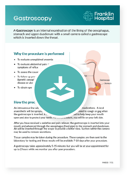 A Gastroscopy is an internal examination of the lining of the oesophagus, stomach and upper duodenum with a small camera called a gastroscope which is inserted down the throat.